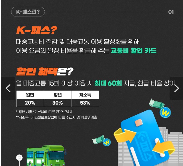 - 서울, 경기도를 비롯한 지역 거주/출퇴근 (*전국 사용) → 대중교통 월 15회 이상 사용 → K-패스