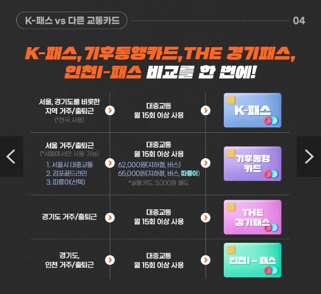 ■ K-패스, 기후동행카드, THE 경기패스, 인천I-패스 비교를 한 번에!