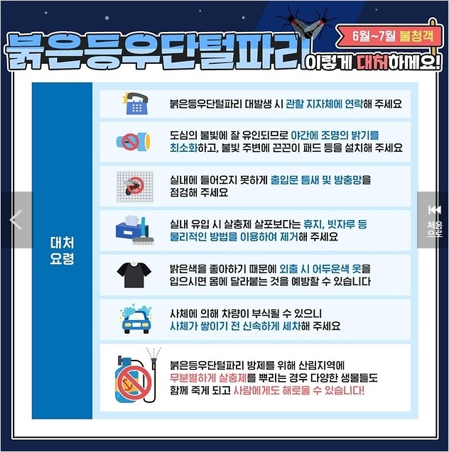 - 애벌레 및 성충 방제 시 농경지, 산림, 도심에서 동시에 진행하여 주변으로 확산하는 것을 방지해 주세요.