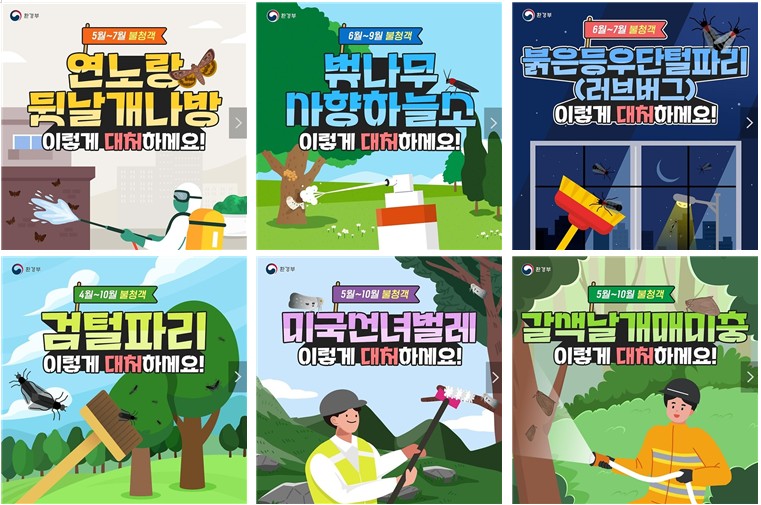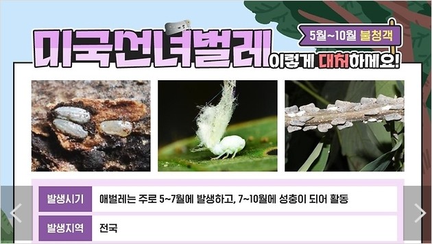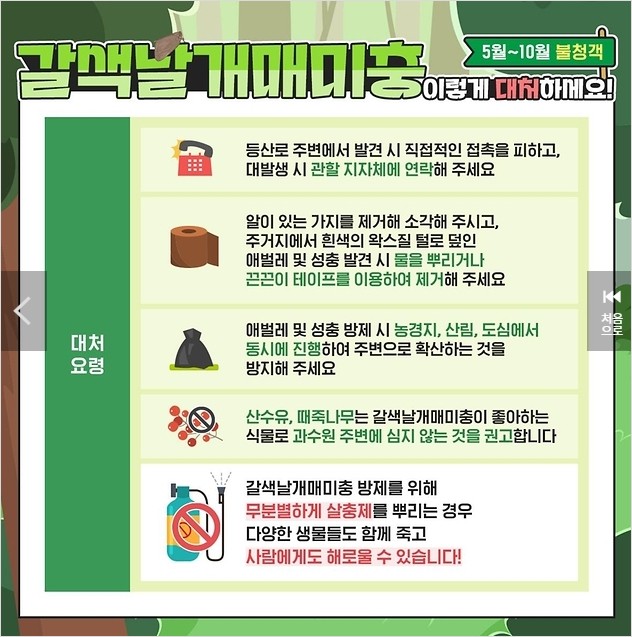 - 등산로 주변에서 발견 시 직접적인 접촉을 피하고, 대발생 시 관할 지자체에 연락해 주세요.