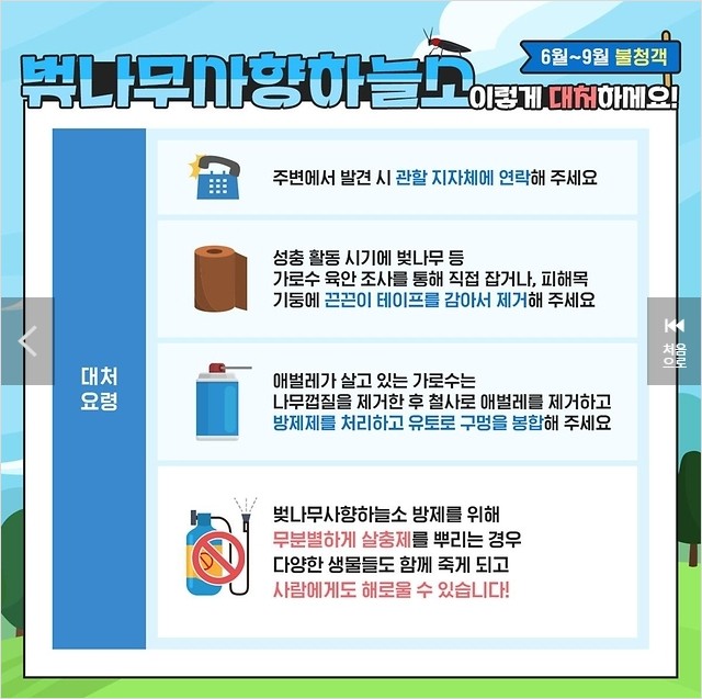 - 벚나무사향하늘소 방제를 위해 무분별하게 살충제를 뿌리는 경우 다양한 생물들도 함께 죽게 되고 사람에게도 해로울 수 있습니다!