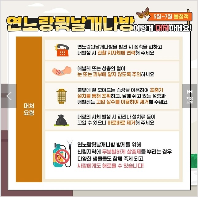 - 연노랑뒷날개나방을 발견 시 접촉을 피하고 대발생 시 관할 지자체에 연락해 주세요.