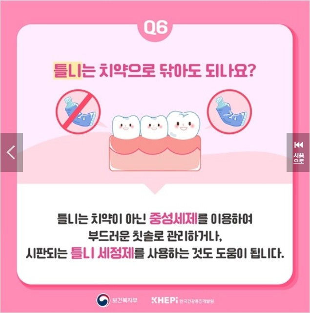 - 틀니는 치약이 아닌 중성세제를 이용하여 부드러운 칫솔로 관리하거나, 시판되는 틀니 세정제를 사용하는 것도 도움이 됩니다.