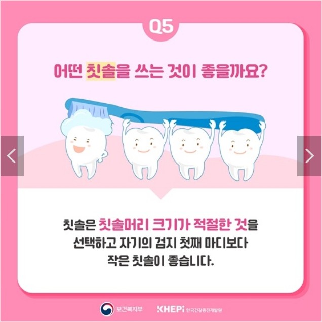 - 칫솔은 칫솔머리 크기가 적절한 것을 선택하고 자기의 검지 첫째 마디보다 작은 칫솔이 좋습니다.