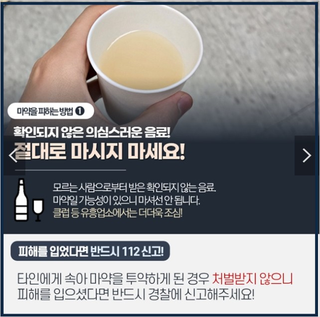 모르는 사람으로부터 받은 확인되지 않는 음료. 마약일 가능성이 있으니 마셔선 안 됩니다. 클럽 등 유흥업소에서는 더더욱 조심!