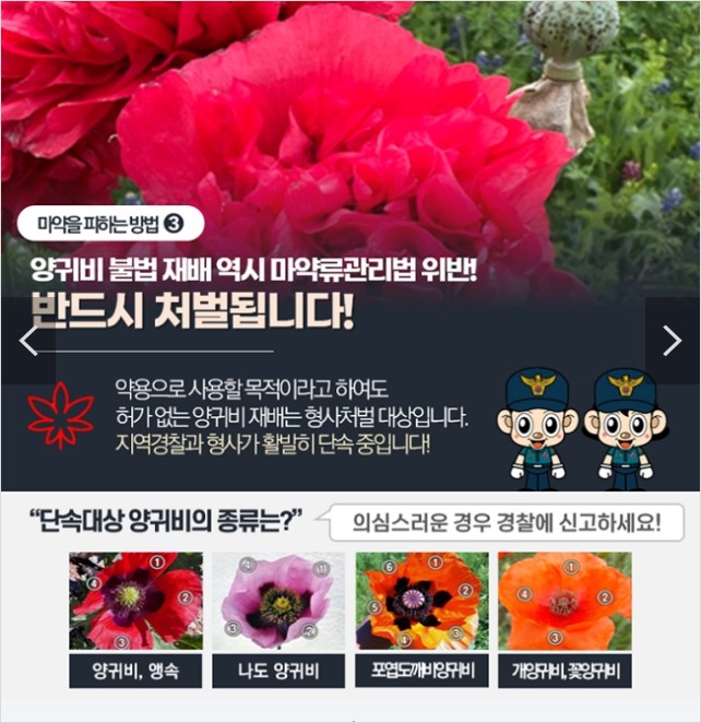 - 양귀비 불법 재배 역시 마약류 관리법 위반! 반드시 처벌됩니다!