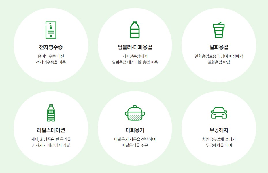 전자영수증 발급, 텀블러·다회용컵 이용, 일회용컵 반환, 리필스테이션 이용, 다회용기 이용, 무공해차 대여, 친환경제품 구매, 고품질 재활용품 배출, 폐휴대폰 반납, 미래세대실천행동 - 참여혜택