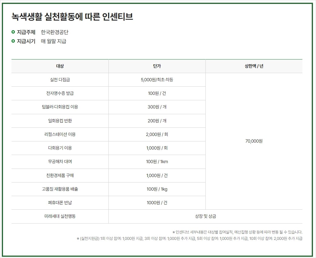 · 친환경제품 구매 : '그린카드(실물카드)'를 사용하여 에코머니 포인트가 100포인트 이상 적립 및 총 결제 금액이 2,000원 이상 또는 '친환경제품 구매 참여기업'에서 결제 수단에 관계없이 2,000원 이상 친환경제품 구매