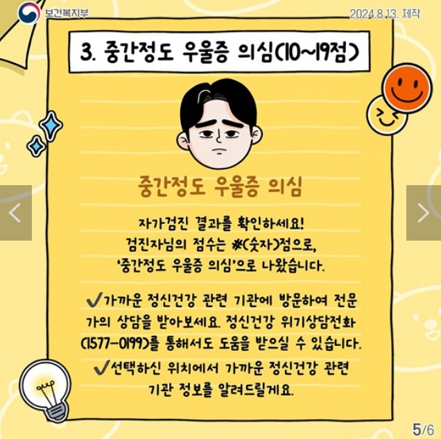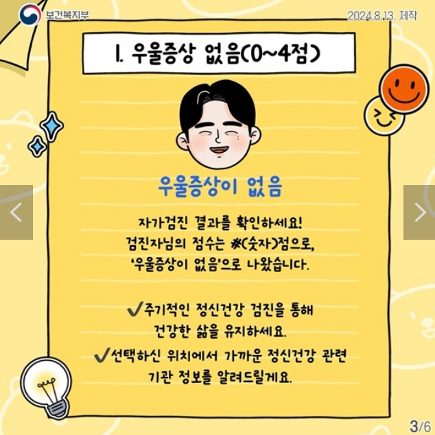 - 검진자님의 점수는 *(숫자)점으로, ‘우울증상이 없음’으로 나왔습니다.
