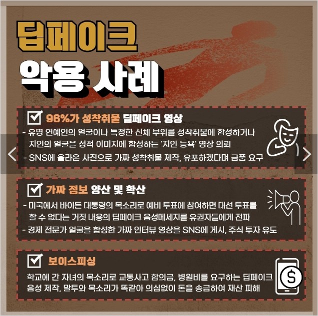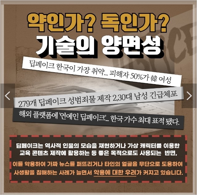 딥페이크는 역사적 인물의 모습을 재현하거나 가상 캐릭터를 이용한 교육 콘텐츠 제작에 활용하는 등 좋은 목적으로도 사용되는 반면, 이를 악용하여 가짜 뉴스를 퍼뜨리거나 타인의 얼굴을 무단으로 도용하여 사생활을 침해하는 사례가 늘면서 악용에 대한 우려가 커지고 있습니다.