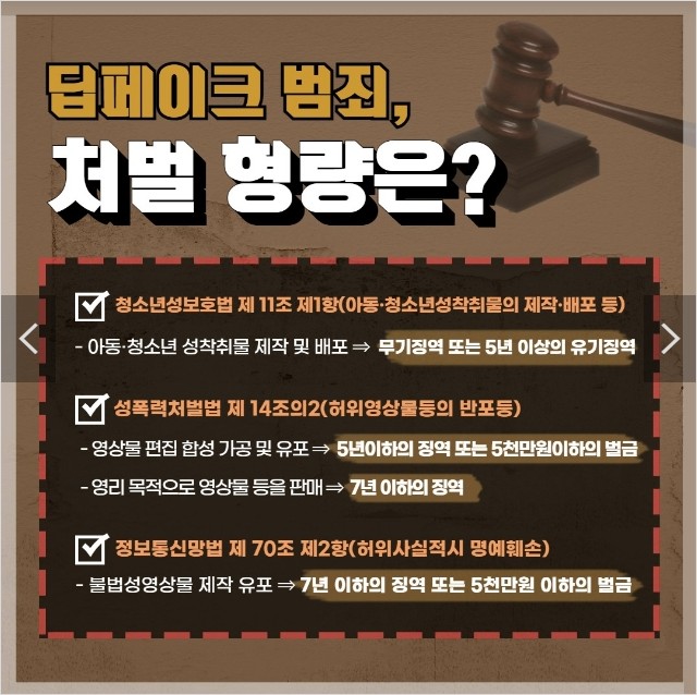 - 불법 성 영상물 제작 유포 → 7년 이하의 징역 또는 5천 만 원 이하의 벌금