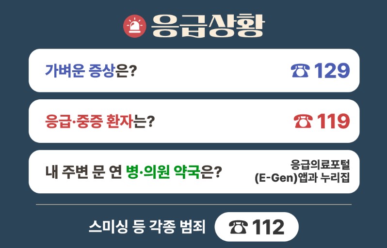 ☎ 119 (안전신고센터) - 내 주변 문 연 병·의원 약국은?