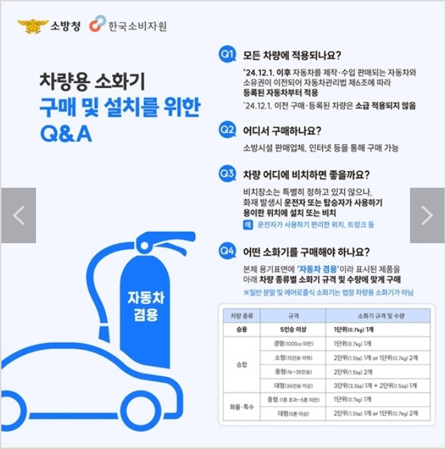 - 본체 용기 표면에 ‘자동차 겸용’이라 표시된 제품을 차량 종류별 소화기 규격 및 수량에 맞게 구매