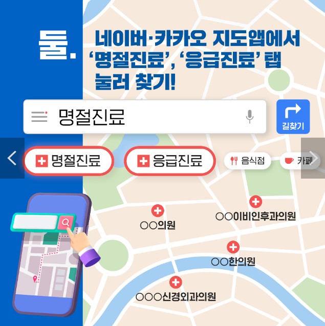 둘, 네이버·카카오 지도앱에서 ‘명절진료’, ‘응급진료’ 탭 눌러 찾기!