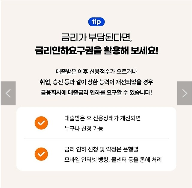 대출받은 이후 신용점수가 오르거나 취업, 승진 등과 같이 상환 능력이 개선되었을 경우 금융회사에 대출금리 인하를 요구할 수 있습니다!