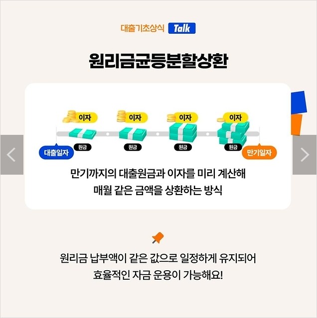 만기까지의 대출원금과 이자를 미리 계산해 매월 같은 금액을 상환하는 방식으로 원리금 납부액이 같은 값으로 일정하게 유지되어 효율적인 자금 운용이 가능해요!