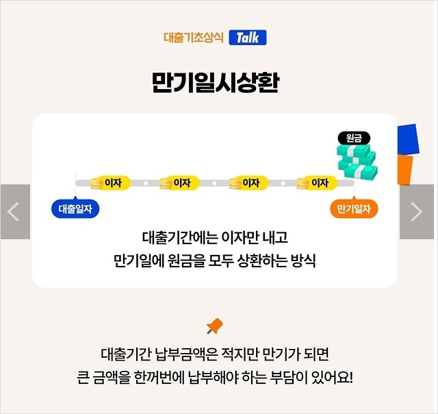 대출일자 만기일자 대출기간에는 이자만 내고 만기일에 원금을 모두 상환하는 방식으로 대출기간 납부금액은 적지만 만기가 되면 큰 금액을 한꺼번에 납부해야 하는 부담이 있어요! - Ⅴ 원금균등분할상환