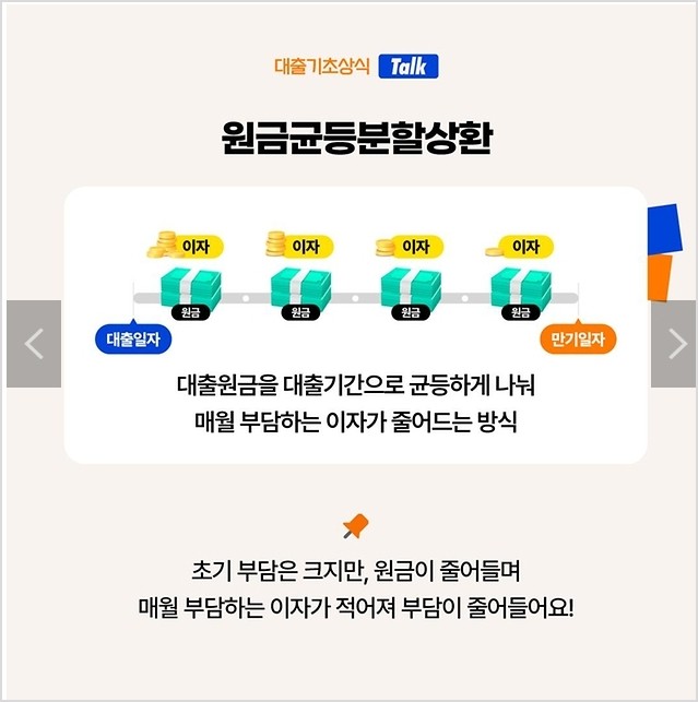 대출원금을 대출기간으로 균등하게 나눠 매월 부담하는 이자가 줄어드는 방식으로 초기 부담은 크지만, 원금이 줄어들며 매월 부담하는 이자가 적어져 부담이 줄어들어요! - Ⅴ 원리금균등분할상환