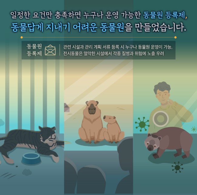 관련 시설과 관리 계획 서류 등록 시 누구나 동물원 운영이 가능하여 전시동물은 열악한 시설에서 각종 질병과 위험에 노출될 우려가 있습니다.