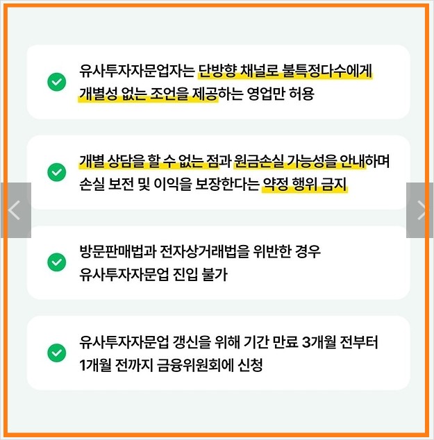 - 유사투자자문업자는 투자자문업 성격을 띠고 있으나 고객과 1:·1 상담이 불가능하며 불특정다수만을 대상으로 상담해야 합니다.