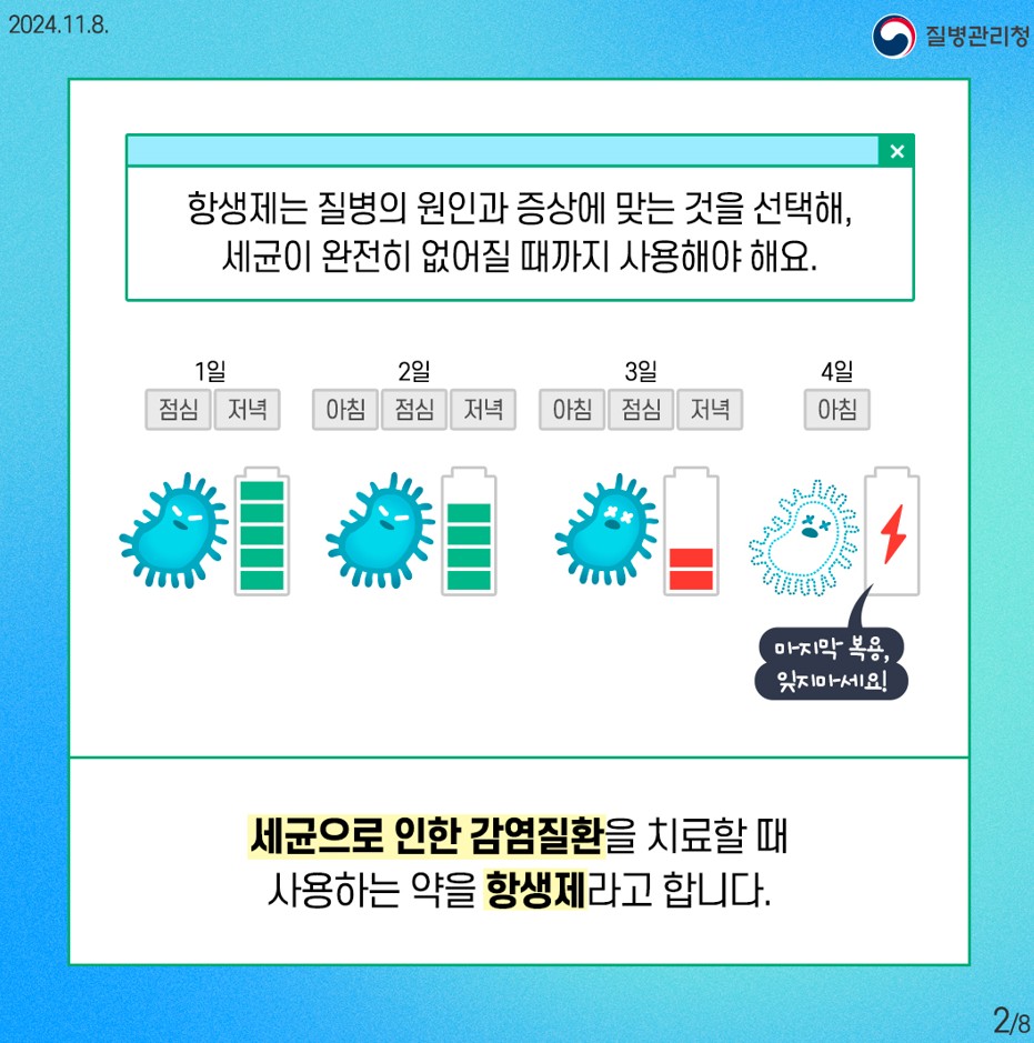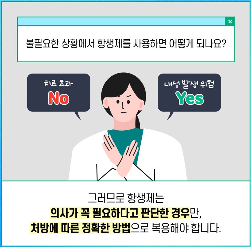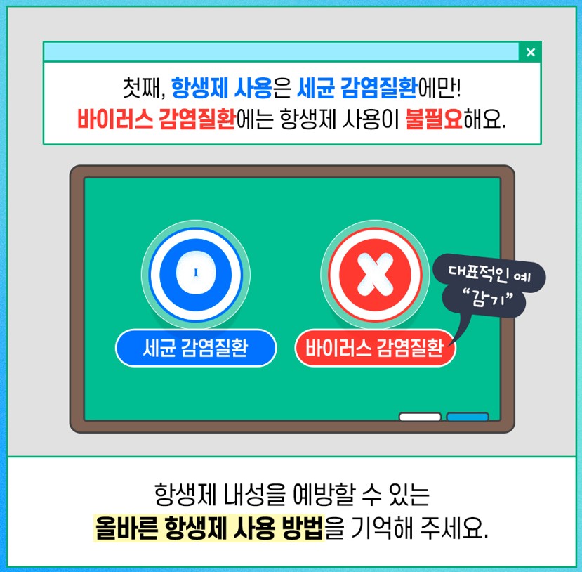 바이러스 감염질환에는 항생제 사용이 불필요합니다. 항생제 내성을 예방할 수 있는 올바른 항생제 사용 방법을 기억해 주세요.