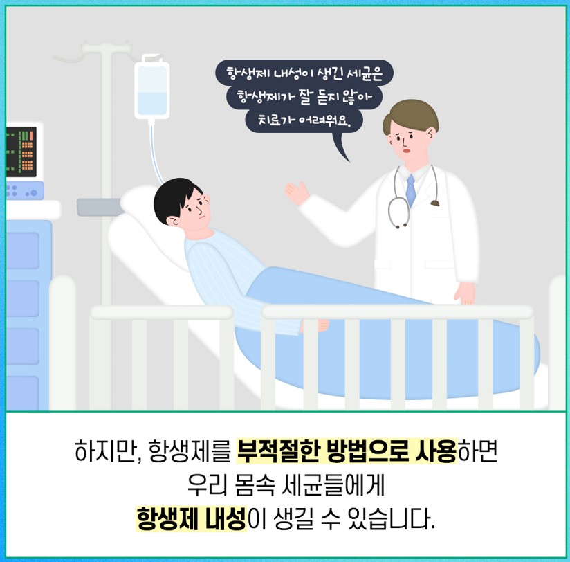 항생제는 질병의 원인과 증상에 맞는 것을 선택해, 세균이 완전히 없어질 때까지 사용해야 합니다. 하지만, 항생제를 부적절한 방법으로 사용하면 우리 몸속 세균들에게 항생제 내성이 생길 수 있습니다.