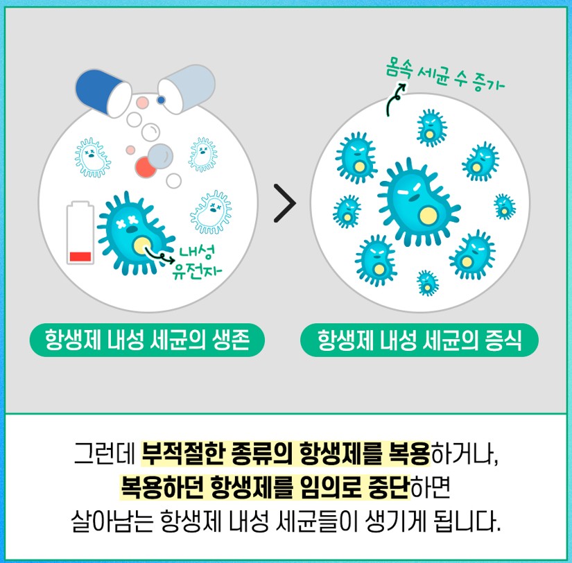 세균들은 항생제를 만나면, 여러 가지 방법으로 적응하면서 항생제 내성 세균으로 변할 수 있고요. 우리 몸에는 다양한 세균이 있고 그중 일부는 항생제에 내성을 가지고 있기도 합니다. 그런데 부적절한 종류의 항생제를 복용하거나, 복용하던 항생제를 임의로 중단하면 살아남는 항생제 내성 세균들이 생기게 됩니다.