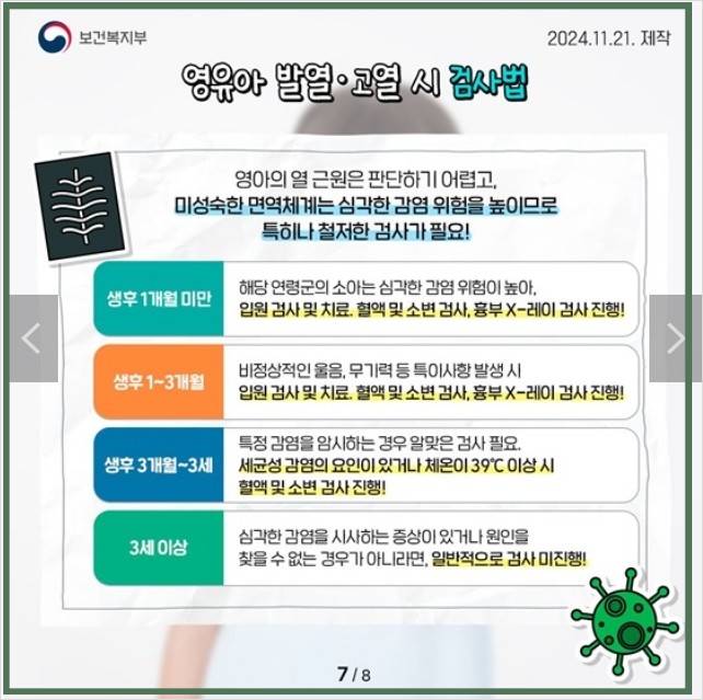 ☞ 영아의 열 근원은 판단하기 어렵고, 미성숙한 면역체계는 심각한 감염 위험을 높이므로 특히나 철저한 검사가 필요