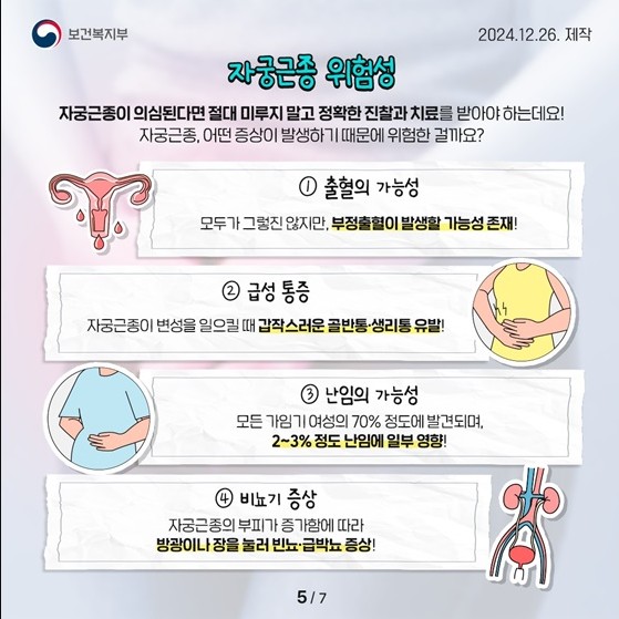 자궁근종의 부피가 증가함에 따라 방광이나 장을 눌러 빈뇨·급박뇨 증상