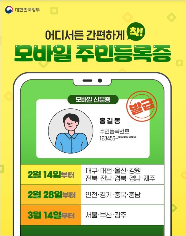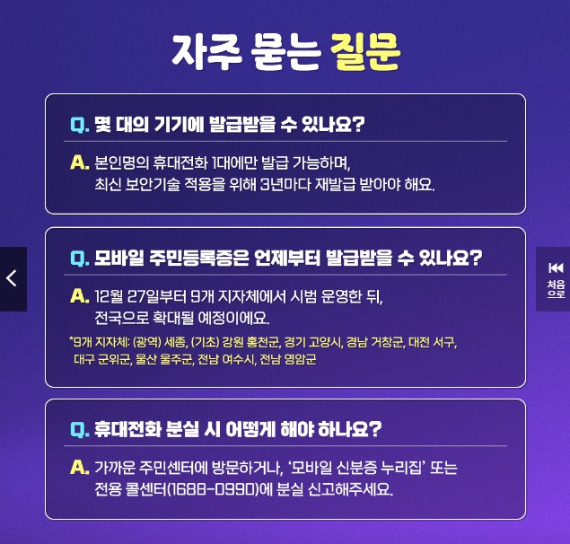 A. 본인명의 휴대전화 1대에만 발급 가능하며, 최신 보안기술 적용을 위해 3년마다 재발급받아야 해요. - Q. 모바일 주민등록증은 언제부터 발급받을 수 있나요?