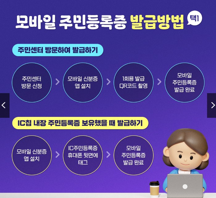주민센터 방문 신청 → 모바일 신분증 앱 설치 → 1회용 발급 QR코드 촬영 → 모바일 주민등록증 발급 완료 - IC칩 내장 주민등록증 보유했을 때 발급하기