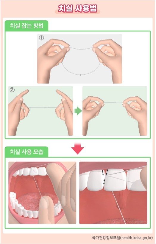 *치태: 치아 표면에 생기는 끈적한 세균막으로, 양치질로 제거하지 못하면 무기질과 결합하여 단단한 치석으로 변함. - 억지로 힘을 주면 피가 날 수 있으므로 천천히 조심해서 사용하고, 한 번 사용한 치실은 버립니다.