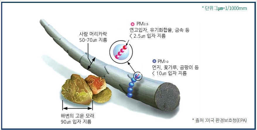 PM10이 사람의 머리카락 지름(50~70㎛)보다 약 1/5~1/7 정도로 작은 크리라면, PM2.5는 머리카락의 약 1/20~1/30에 불과할 정도로 매우 작습니다.