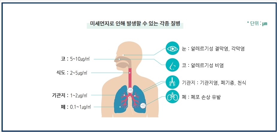 - 미세먼지는 눈에 보이지 않을 만큼 매우 작기 때문에 대기 중에 머물러 있다 호흡기를 거쳐 폐 등에 침투하거나 혈관을 따라 체내로 이동하여 들어감으로써 건강에 나쁜 영향을 미칠 수도 있습니다.