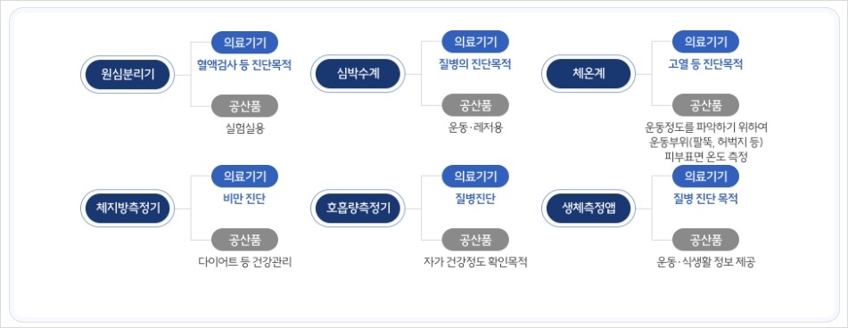 - 원칙적으로 질병의 진단·치료 등 ‘의료용’인 경우에는 의료기기에 해당되고, ‘비의료용’인 경우에는 공산품으로 구분