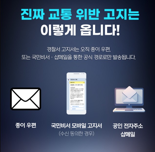 경찰서 고지서는 오직 종이 우편, 또는 국민비서·샵메일을 통한 공식 경로로만 발송됩니다.