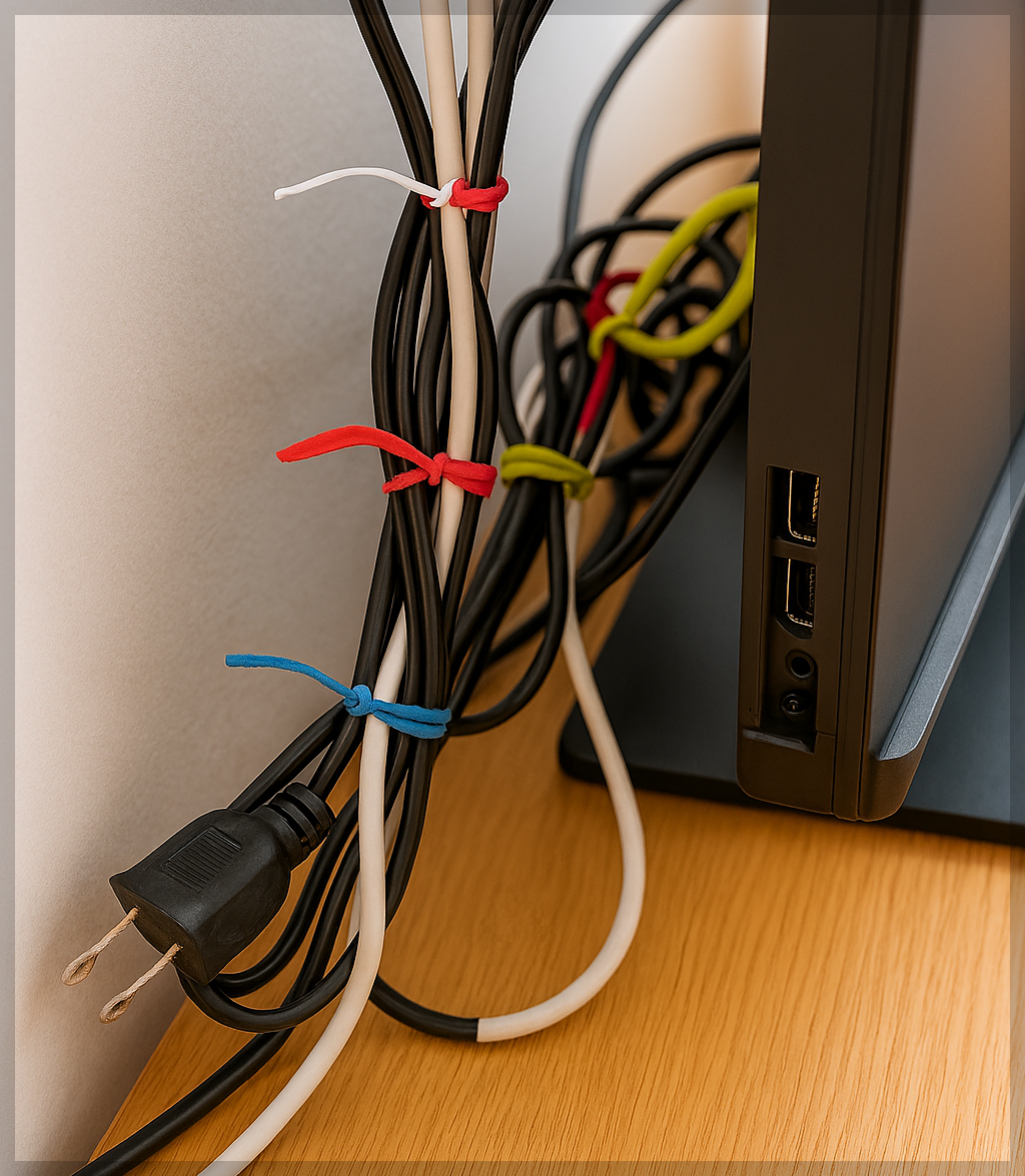 - 책상 아래나 TV 뒤엉킨 전선들을 보면 한숨부터 나오죠. 이럴 땐 빵 묶는 철사를 활용해 보세요. 빵 봉지에 들어 있는 얇은 철사로 전선을 묶어주면 보기에도 깔끔하고, 나중에 전선을 교체하거나 정리할 때도 훨씬 편합니다. 색깔별로 구분해서 묶으면 어떤 전선인지 쉽게 알 수도 있어 더욱 좋습니다.
