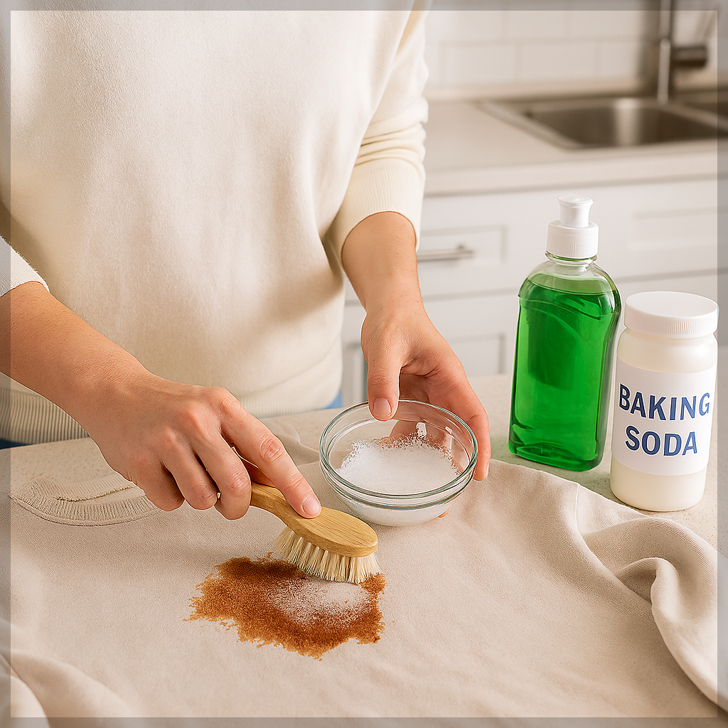 - 옷에 김치 국물이나 커피를 쏟았을 때 당황하지 마세요. 주방 세제와 베이킹 소다만 있으면 얼룩을 쉽게 제거할 수 있습니다. 먼저 따뜻한 물에 베이킹 소다를 녹인 후, 주방 세제를 몇 방울 떨어뜨려 잘 섞어줍니다. 이 용액을 얼룩진 부분에 바르고 부드러운 솔로 살살 문지른 다음 헹궈내면 대부분의 얼룩이 말끔하게 사라집니다.