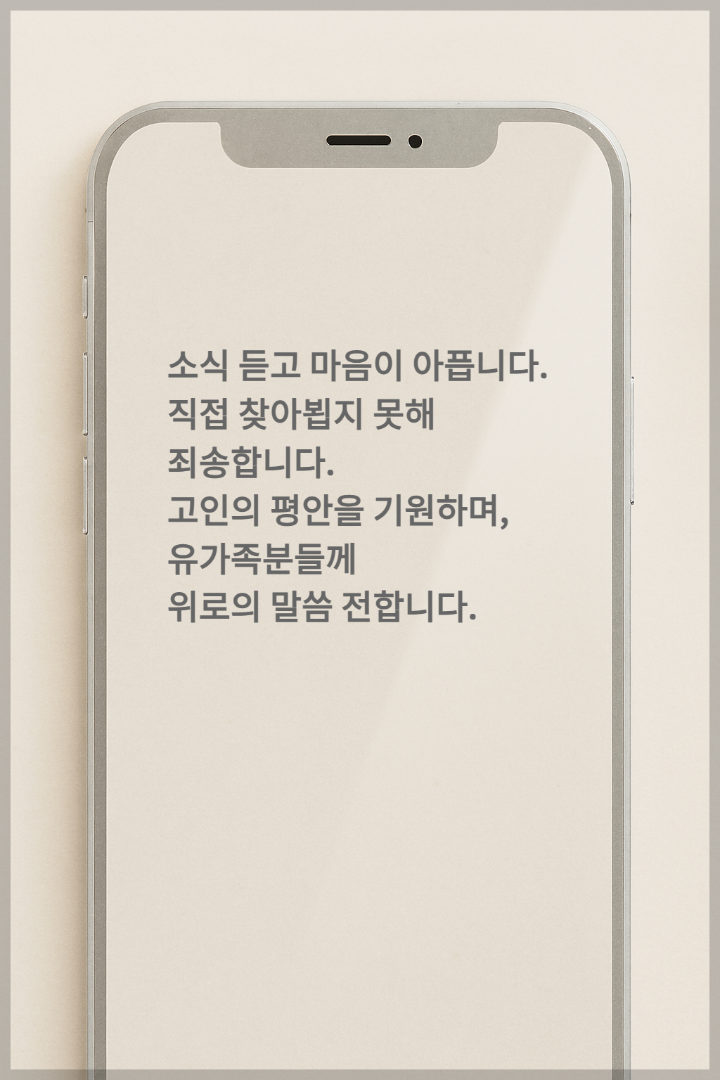 소식 듣고 마음이 아픕니다. 직접 찾아뵙지 못해 죄송합니다. 고인의 평안을 기원하며, 유가족분들께 위로의 말씀 전합니다. - 4. 조의금 전달 의사를 함께 전할 경우