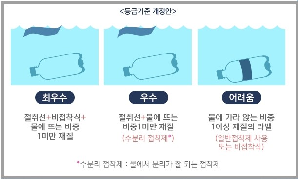이를 감안하여 비중 분리기준 1 미만 재질의 절취선 라벨과 물에서 분리가 잘 되는 접착제를 사용한 경우 '우수 등급'을 부여하고, 접착제를 사용하지 않으면서 비중 분리가 가능한 라벨은 '최우수 등급'으로 구분해 국내 생산이 확대되도록 유도하고 있습니다.
