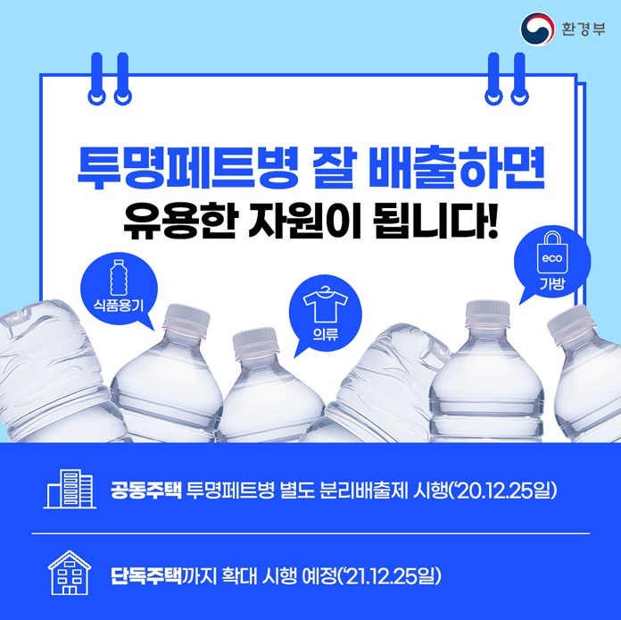 2019년 12월25일부터 음료·생수 페트병에 유색 몸체 및 잘 떨어지지 않는 접착제 사용을 금지했다.