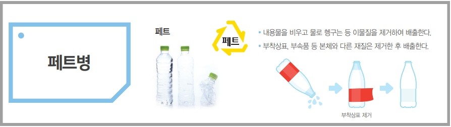 - 페트병, 라벨, 뚜껑은 가급적 분리해서 별도 배출한다.