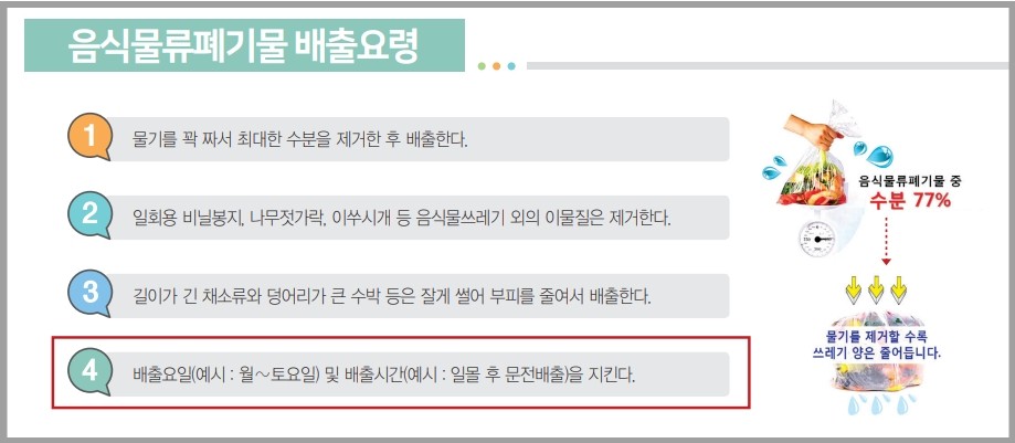 - 지자체별 배출 요일 및 배출시간을 지켜서 배출한다.