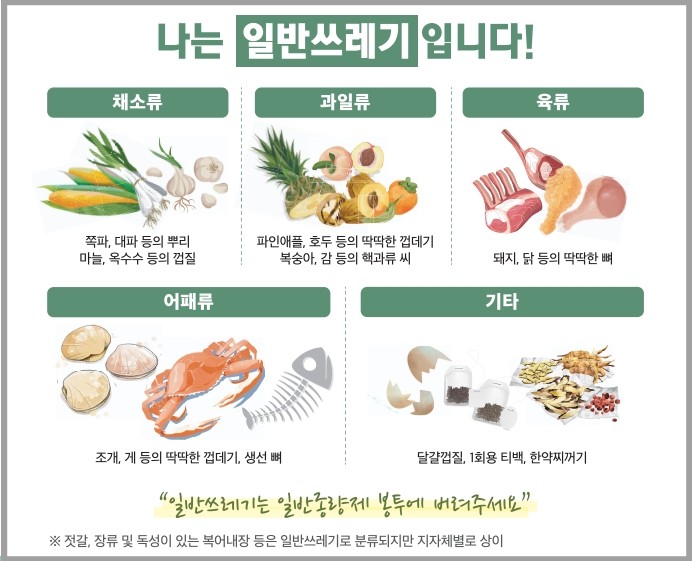 - 크고 단단한 과일 씨나 씨방(씨를 감싸고 있는 과일 심)은 일반쓰레기(종량제 봉투)로 배출한다.