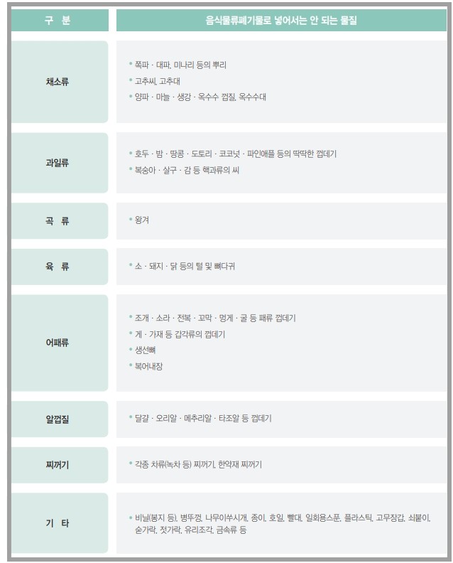 - 일회용 비닐봉지, 나무젓가락, 이쑤시개 등 음식물쓰레기 외의 이물질은 제거한다.